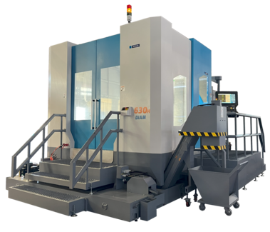 Centre d'usinage à broche horizontale et table croisée rotative.